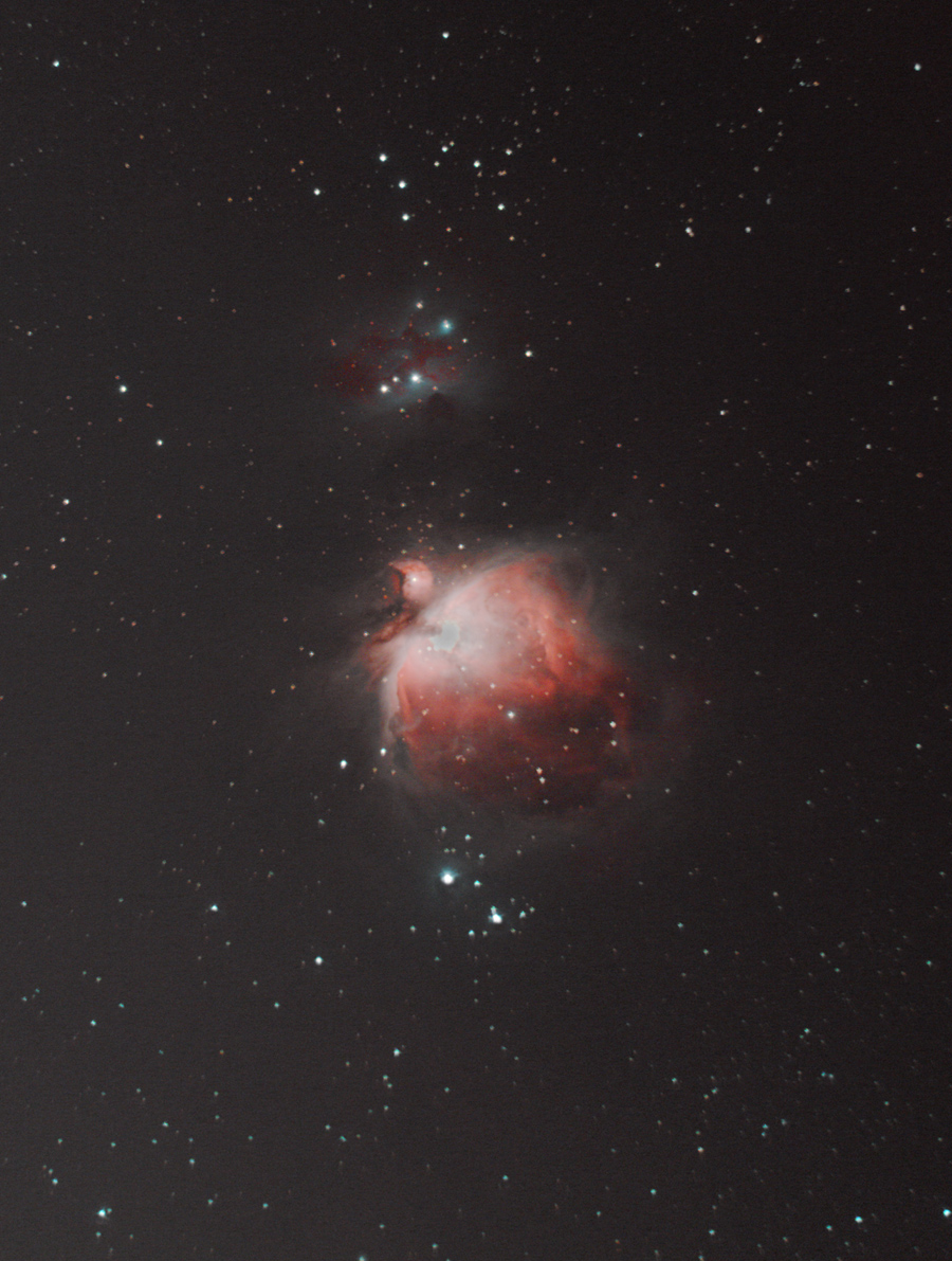 The region around M42 in Orions sword. 3 pane mosaic. Modified Canon 350D on a WO80mm refractor. EQ6 mount. 3 x 8 x 4 minutes plus 8 x 1 minute for the central bright frame layered and faded in @ f7 800ASA