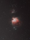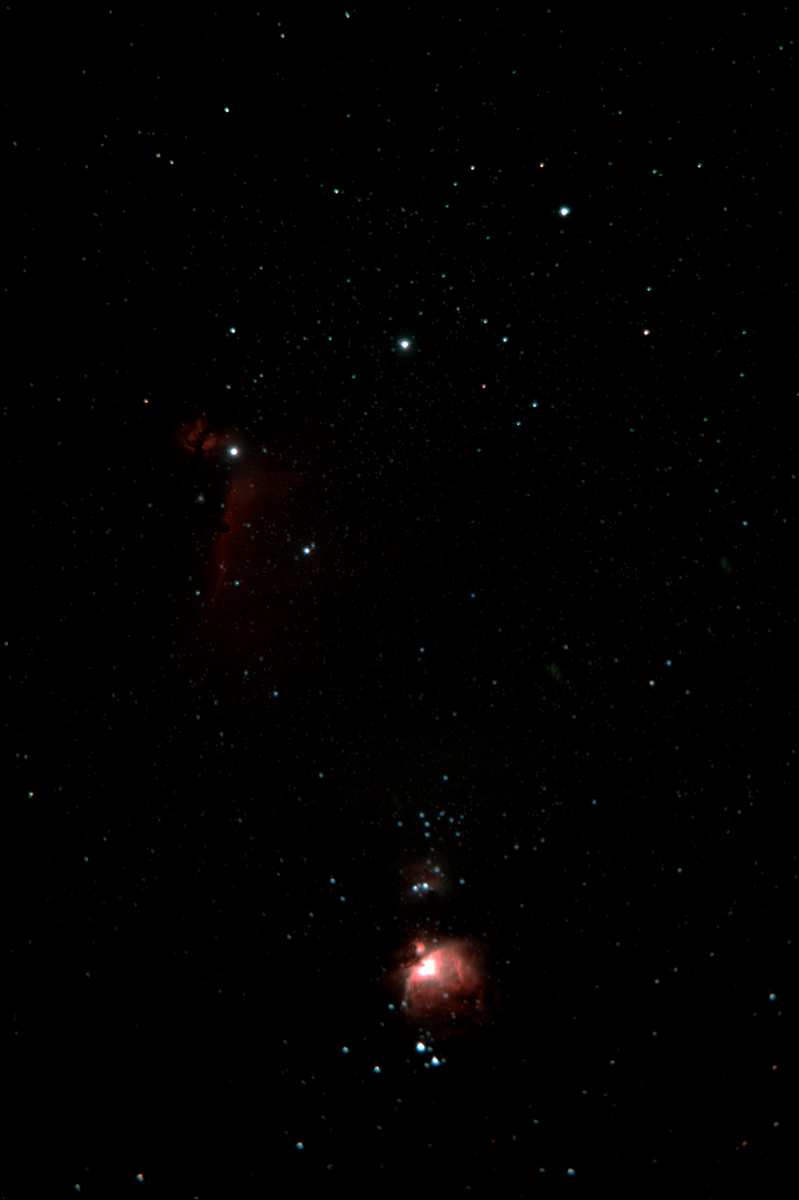 The central region of Orion showing the belt, sword and nebulae. Modified Canon 350D with a 70 to 160mm zoom lens and Baader UHC filter. EQ6 mount. 8 x 4 minutes @ 100mm, f3.5 800ASA