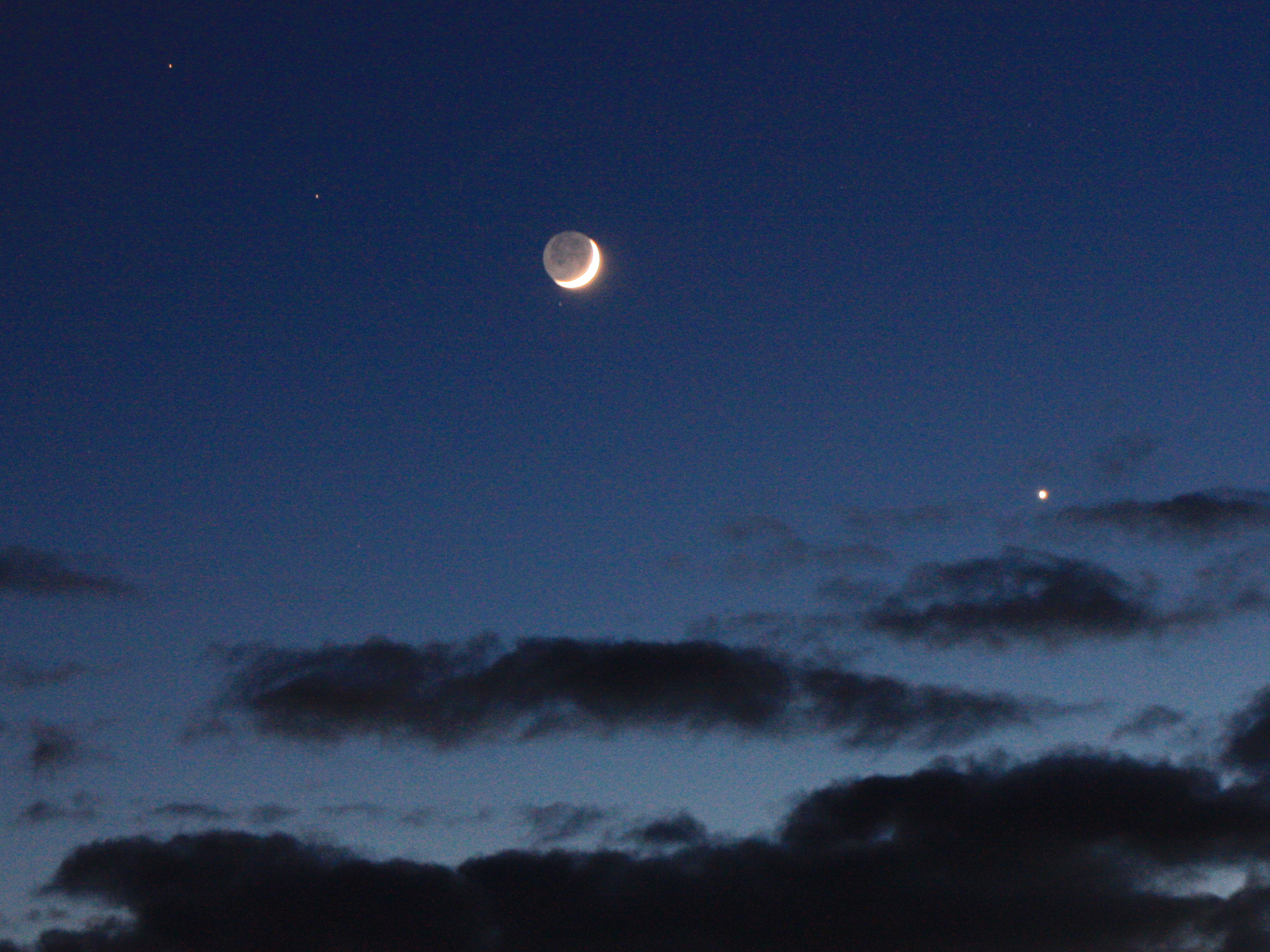 The follwing image was taken in Upwey, Weymouth during May 2010 and shows the Moon with Earth-shine on it and Venus is very bright in the lower right. There are 3 other stars, one under the Moon (Propus1) and two others to the upper left (Propus 7eta and 18nu) in Gemini.